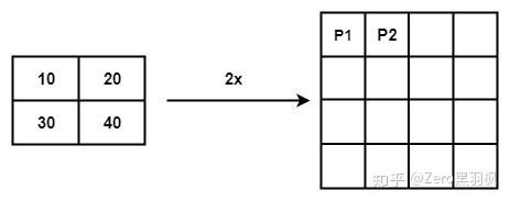 例子中是将一个 2x2 的矩阵通过插值的方式得到 4x4 的矩阵,那么将 2x2 的矩阵称为源矩阵,4x4 的矩阵称为目标矩阵。双线性插值中,目标点的值是由离他最近的 4 个点的值计算得到的,我们首先介绍如何找到目标点周围的 4 个点,以 P2 为例。
