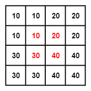 为了找到那 4 个点,首先要找到目标点在源矩阵中的相对位置,上面的公式就是用来算这个的。P2 在目标矩阵中的坐标是 (0, 1),对应到源矩阵中的坐标就是 (-0.25, 0.25)。坐标里面居然有小数跟负数,不急我们一个一个来处理。我们知道双线性插值是从坐标周围的 4 个点来计算该坐标的值,(-0.25, 0.25) 这个点周围的 4 个点是(-1, 0), (-1, 1), (0, 0), (0, 1)。为了找到负数坐标点,我们将源矩阵扩展为下面的形式,中间红色的部分为源矩阵。