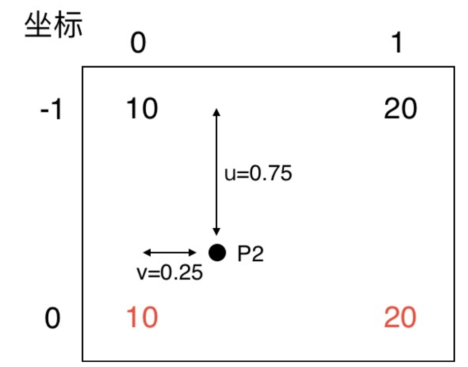 我们规定 f(i, j) 表示 (i, j)坐标点处的像素值,对于计算出来的对应的坐标,我们统一写成 (i+u, j+v) 的形式。那么这时 i=-1, u=0.75, j=0, v=0.25。把这 4 个点单独画出来,可以看到目标点 P2 对应到源矩阵中的相对位置。