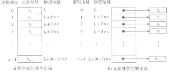 图b为分离式结构,表对象里只保存与整个表有关的信息(即容量和元素个数),实际数据元素存放在另一个独立的元素存储区里,通过链接与基本表对象关联。